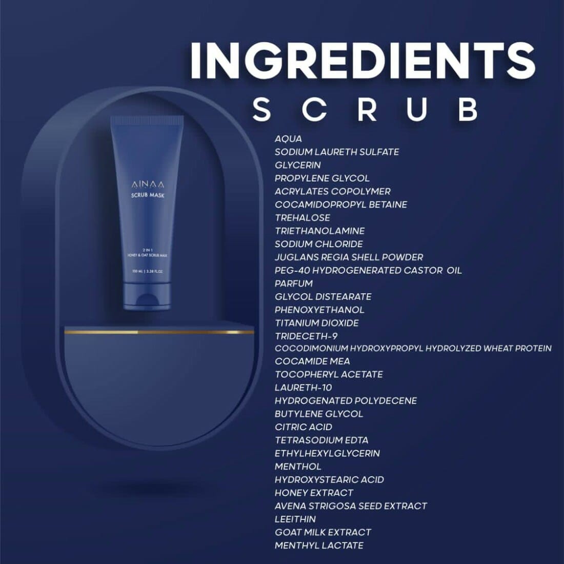 Aqua, Sodium Laureth Sulfate, Glycerin, Propylene Glycol, Acrylates Copolymer, Cocamidopropyl Betaine, Trehalose, Trietahnolamine, Sodium Chloride, Juglans Regia Shell Powder, Peg-40 Hydrogenated Castor Oil, Parfum, Glycol Distearate, Phenoxyethanol, Titanium Dioxide, Trideceth-9, Cocodimonium Hydroxypropyl Hydrolyzed Wheat Protein, Cocamide Mea, Tocopheryl Acetate, Laureth-10, Hydrogenated Polydecene, Butylene Glycol, Citric Acid, Tetrasodium Edta, Ethylhexyglycerin, Menthol, Hydroxystearic Acid, Honey Extract, Avena Strigosa Seed Extract, Lecithin, Goat Milk Extract, Menthyl Lactate.